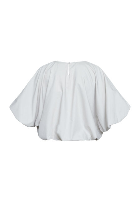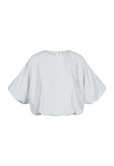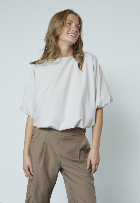 GUFO-TOP er en ballongtopp med rund hals og korte, voluminøse ermer. Blusen har en elastisk kant nederst, noe som skaper en puffeffekt. Den har en løs og behagelig passform. Modellen har en størrelse S på seg.