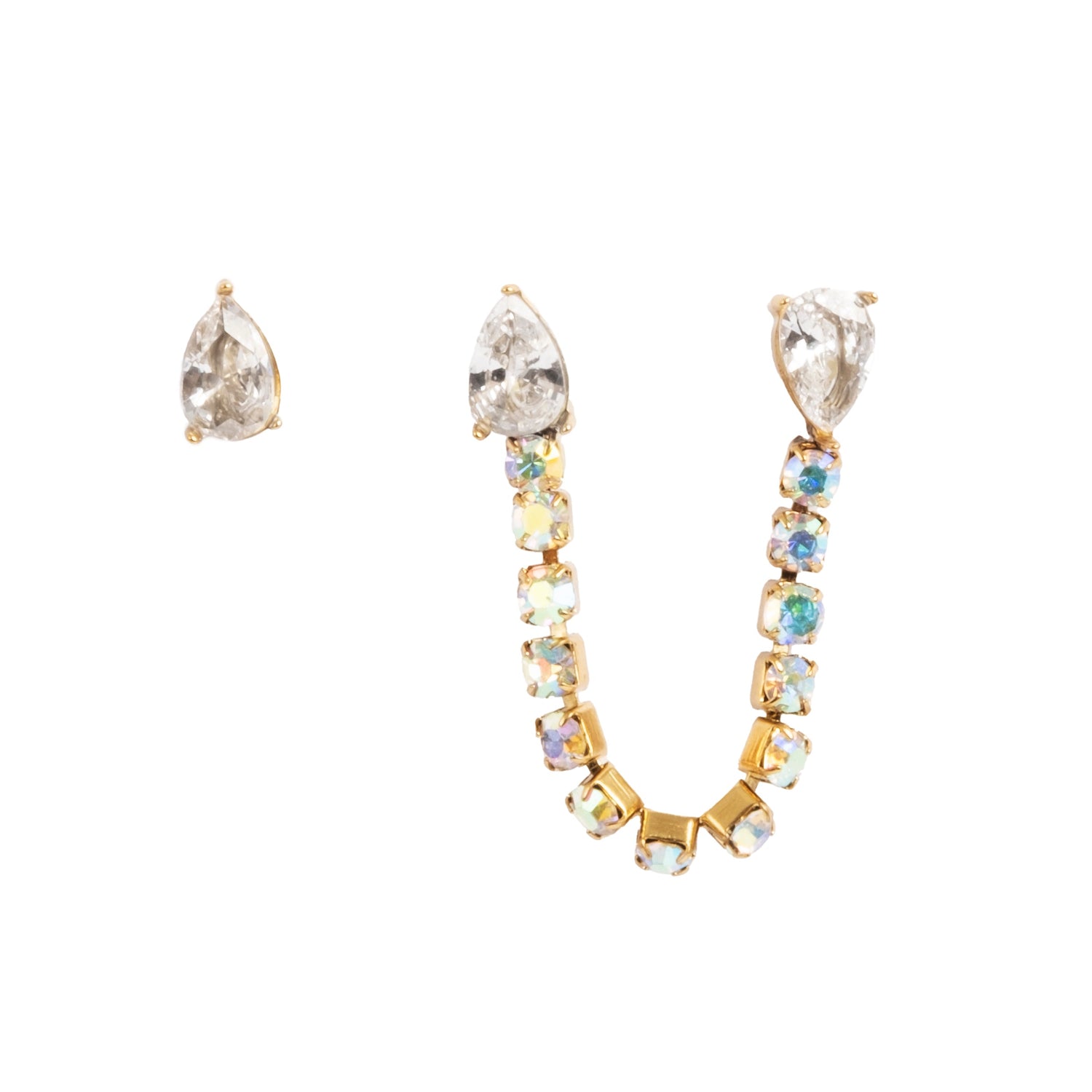 Se så fint! Har du to hull i øret er dette øredobbsettet helt perfekt. Lite og nett - perfekt til hverdag og elegant til fest! Krystallsteiner i Aurora Borealis effekt. Tone Damli by A&C Oslo, en smykkekolleksjon som oser av femininitet, lekenhet og eleganse. Høy kvalitet, laget i begrenset antall. Designsmykke i polert stål. belagt med ekte gull. Nikkelfritt.