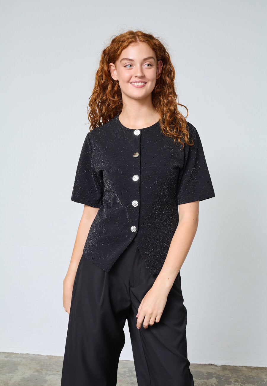 En nydelig topp med et veldig flatterende snitt. Toppen sitter inntil og fremhever midjen. Kan være litt liten i str, vi anbefaler at du går opp en størrelse. Denne toppen er perfekt til Glut pant med glitter