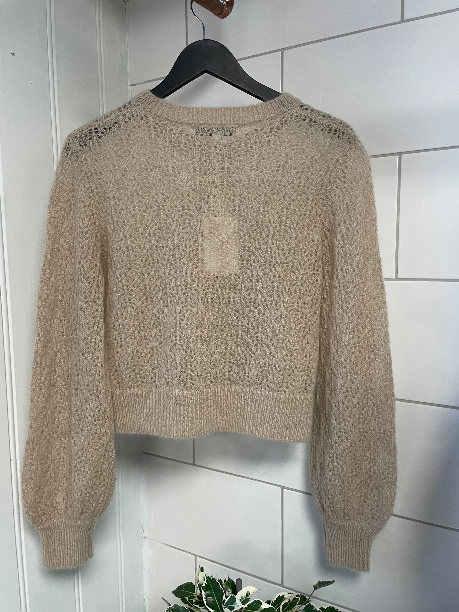 Vakker cardigan i nydelig mønsterstrikk. Den er medium lang, har lange ballongermer med bred mansjett og full knappestolpe. Lett og myk kvalitet, en veldig pen strikk også til finere anledninger.