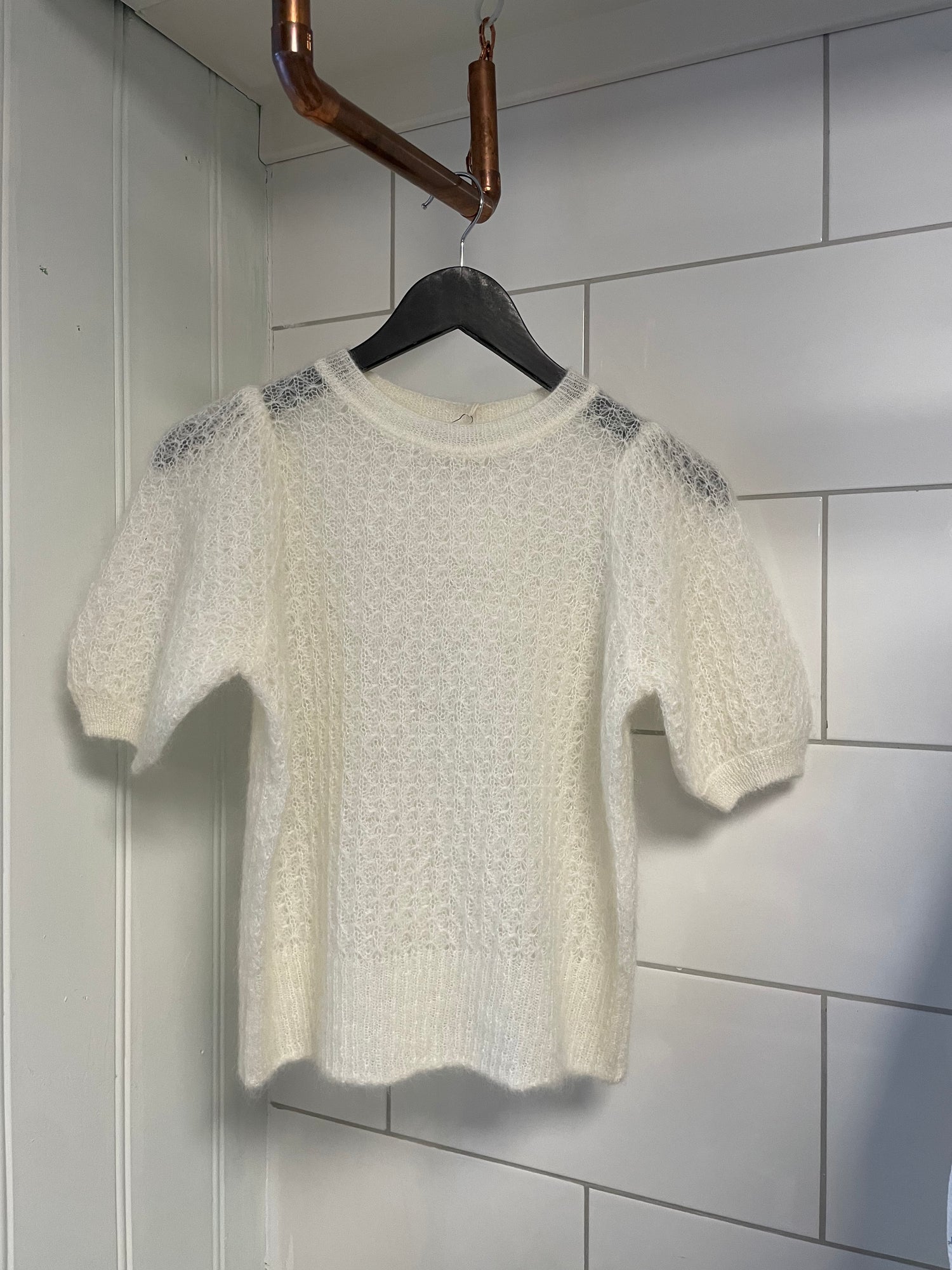Designet med rund hals, puffede skuldre og delikat strikket tekstur. Soft, deilig og luftig kvalitet.