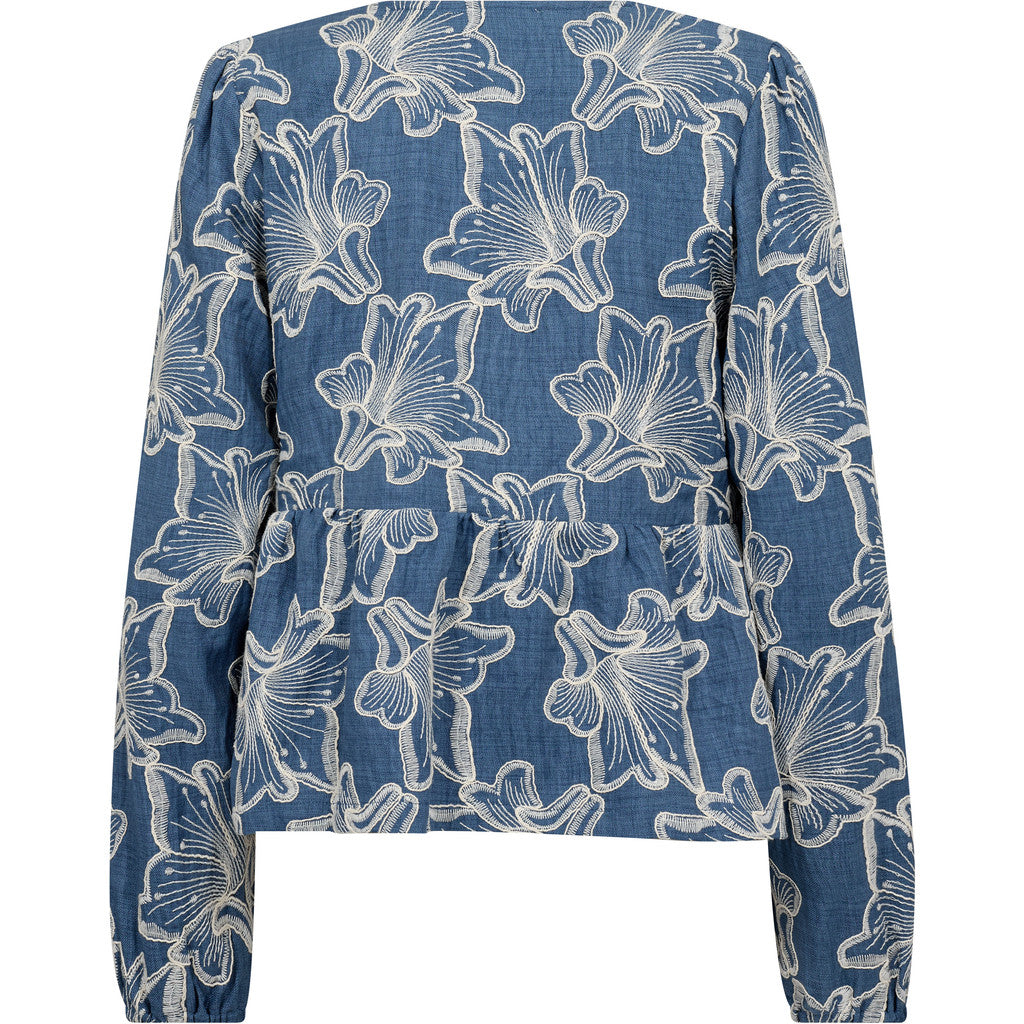 En nydelig bluse i et mykt denim stoff med creme farget broderi. Blusen har en søt peplum fasong med knyting i front.