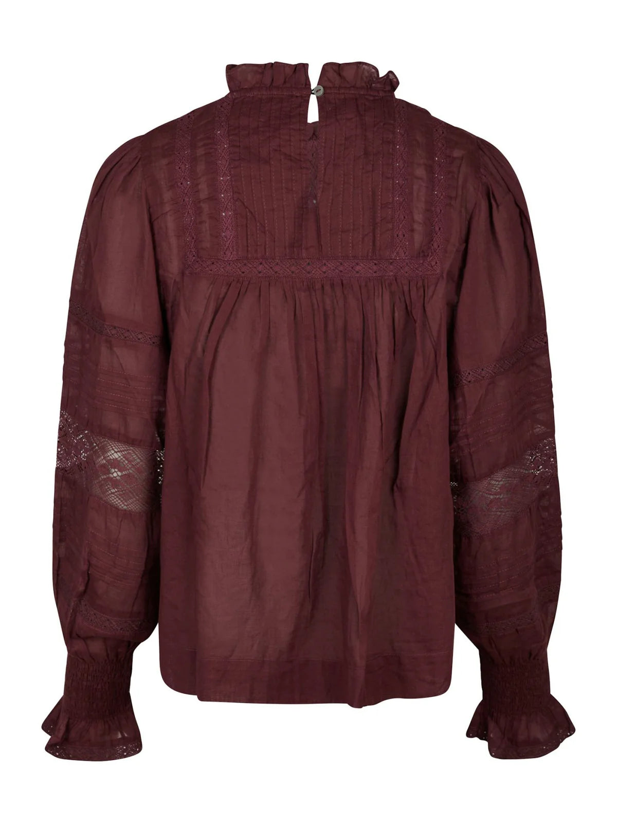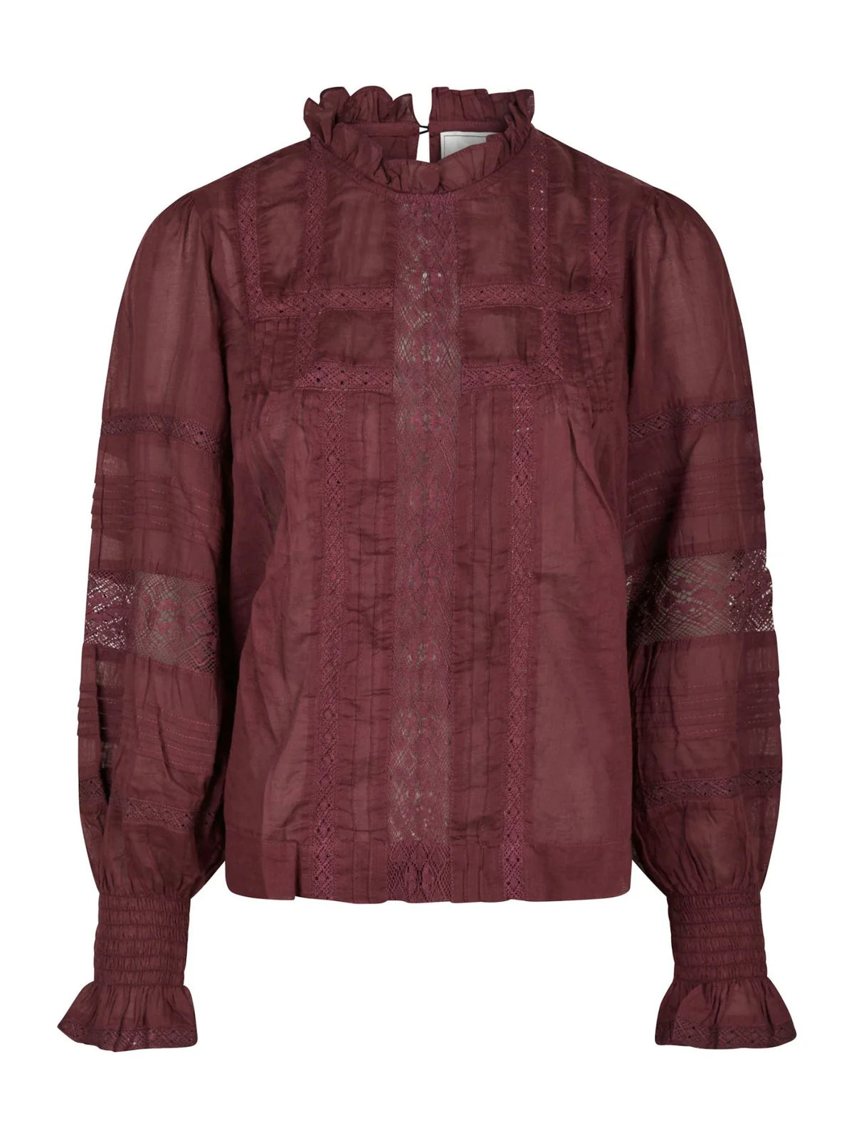 En lett og luftig bluse i bomull. Modellen har dekorative bånd og fine detaljer som gir et feminint preg. Den kommer i en dyp wine-farge som gir et elegant uttrykk og gjør den enkel å style både til hverdag og fest. Den løse passformen gjør blusen behagelig å bruke, samtidig som den ser stilfull ut.
