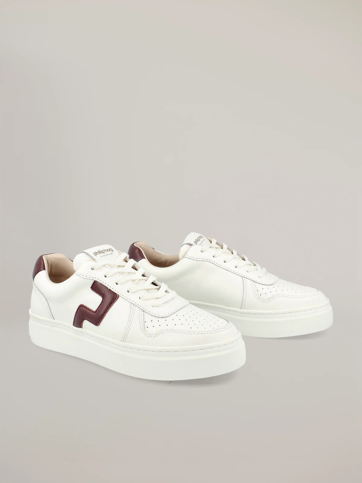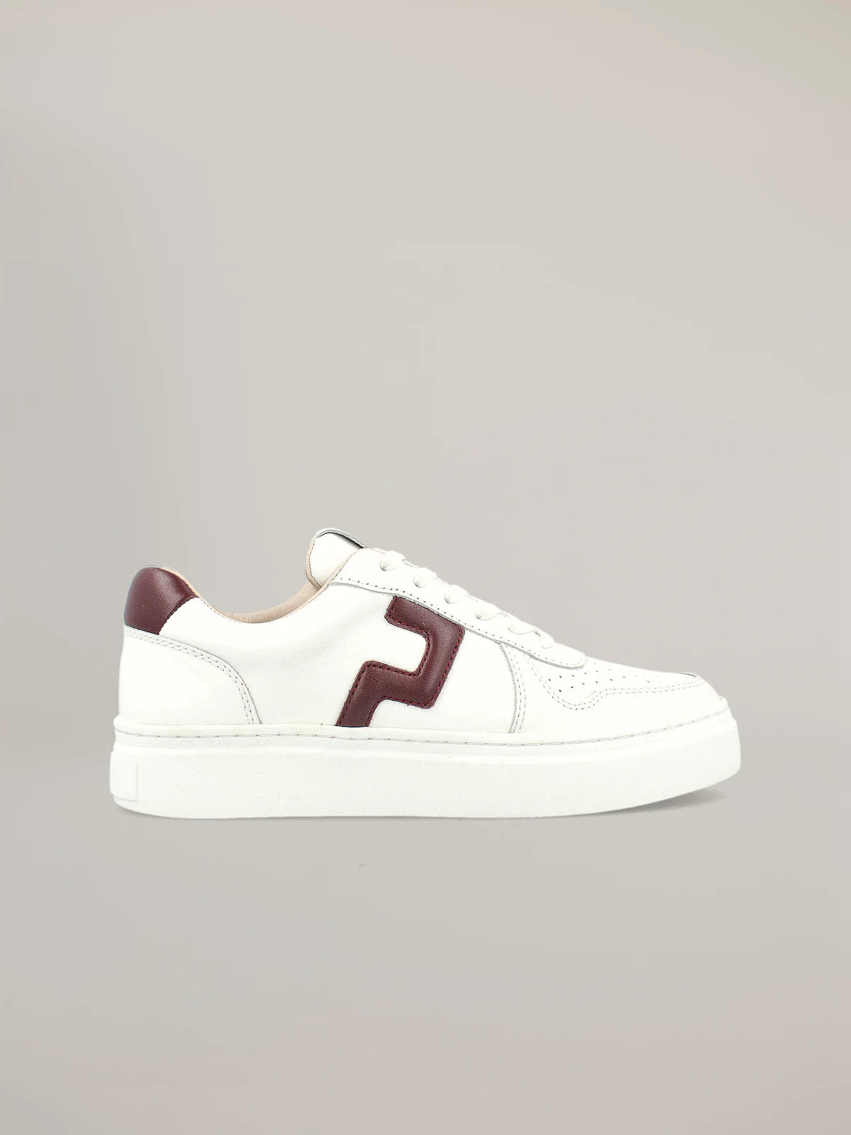 Tidløse og allsidige sneakers i hvitt skinn med kontrastdetaljer i burgunder. Komfortabel såle og rent design gjør dem perfekte både til hverdags og mer sporty antrekk.