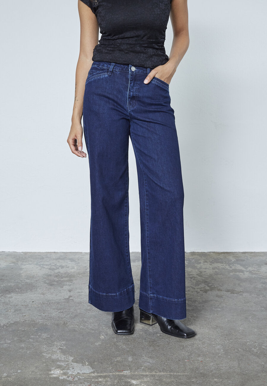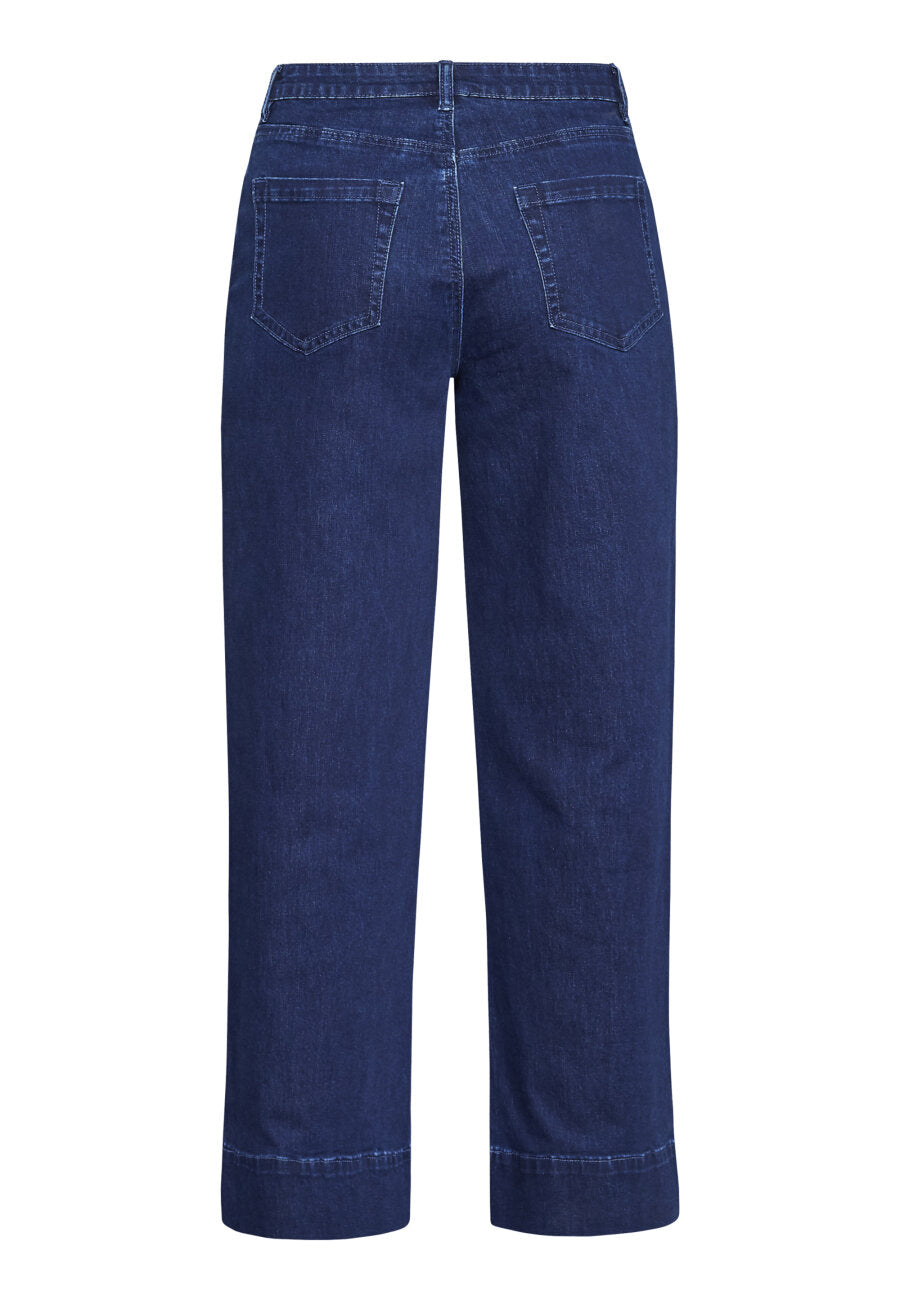 FEJA-JE er et par cropped, wide-leg jeans i et lett denim-materiale med et høyt liv og små lommer i front. Jeansen har en ren, bred kant nederst, som gir et moderne uttrykk. Modellen har en str. S på.