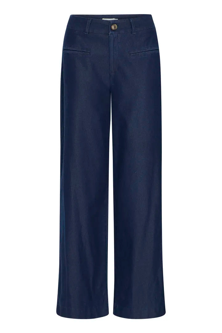 Kate Denim Trousers er en elegant bukse med en smart tvist. Den ser ut som en klassisk dressbukse, men er sydd i myk og stretchy denim som gir høy komfort. Buksen har høyt liv, rette ben og full lengde. Med sitt tidløse snitt passer den både til hverdags og mer pyntede anledninger.