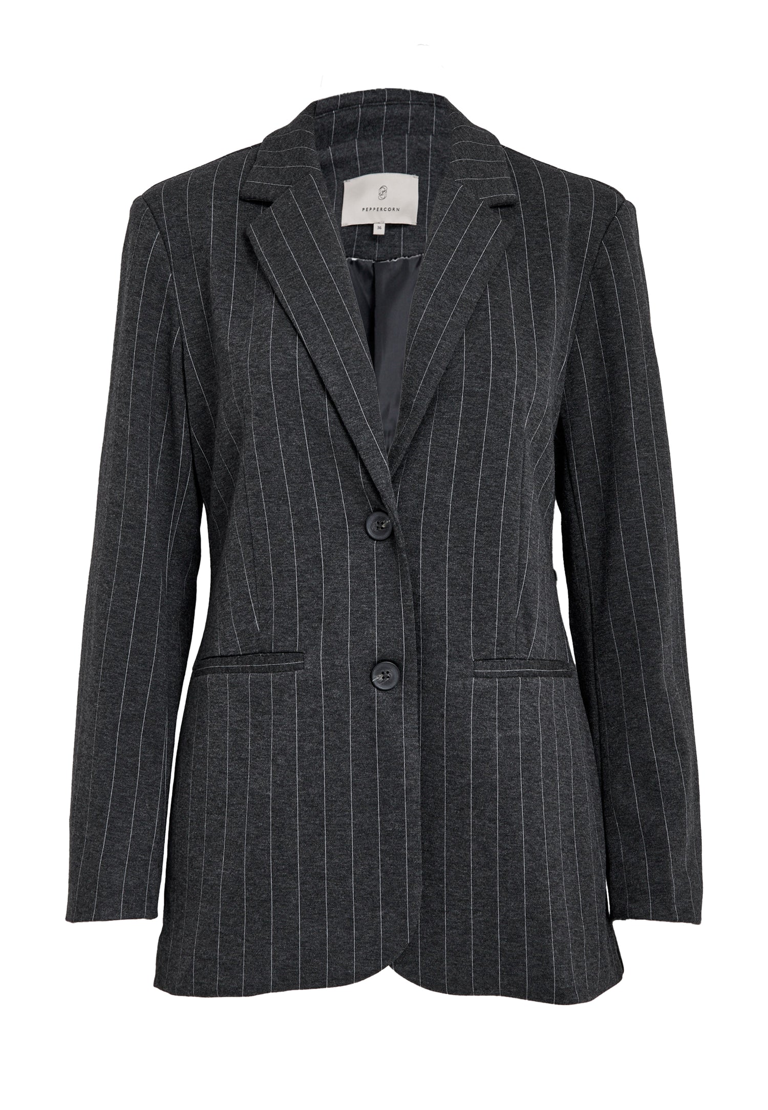 En tidløs og elegant blazer med klassiske pinstripes. Modellen har en lett innsvinget fasong som gir en feminin silhuett, og lukkes med to knapper i front. Blazeren har klassiske slag, rette frontlommer og et rent, stilfullt uttrykk som gjør den like anvendelig til hverdags som til mer formelle anledninger.
