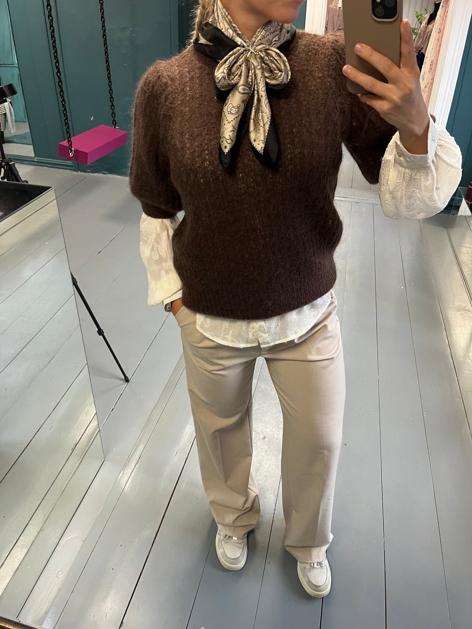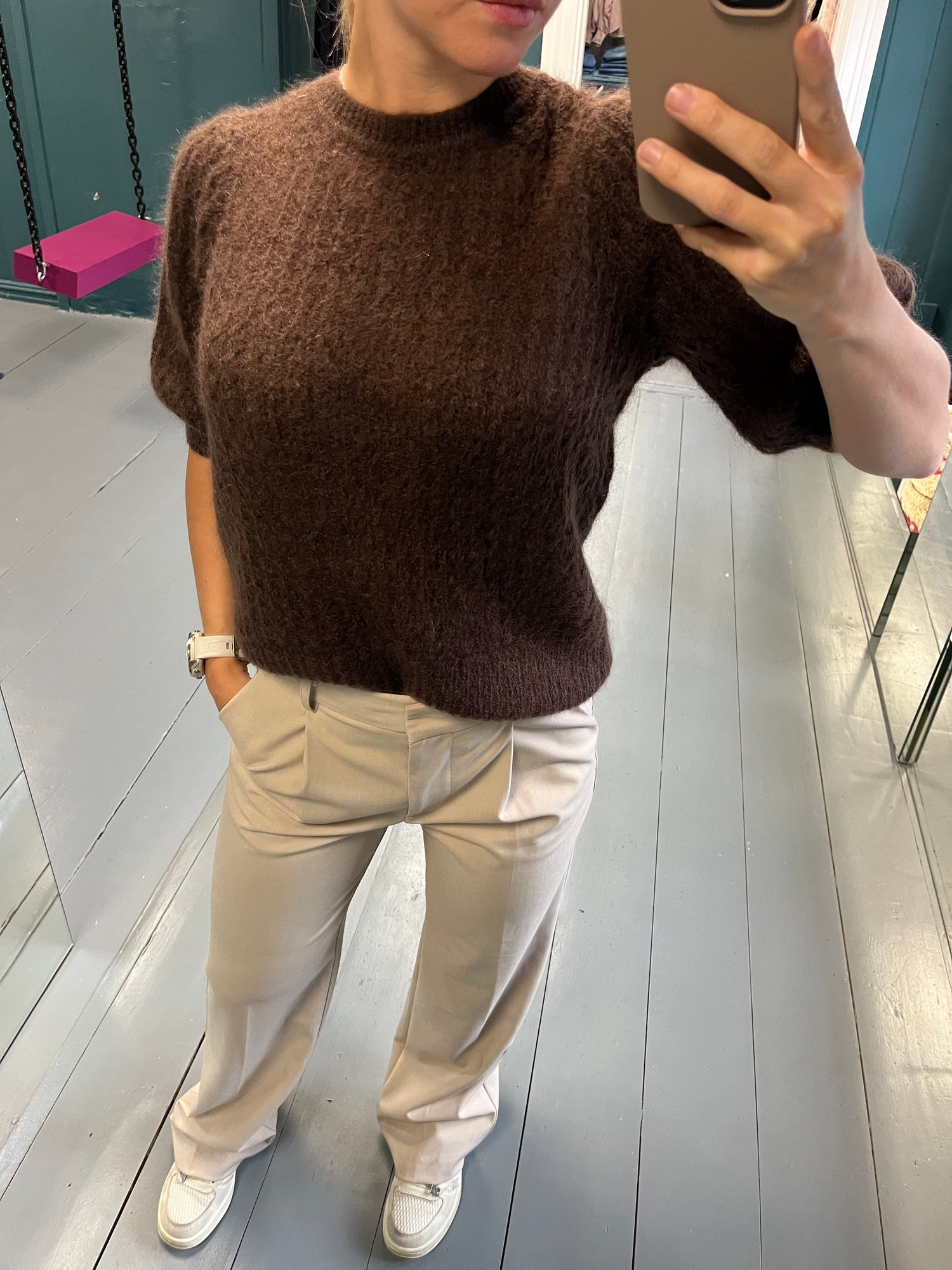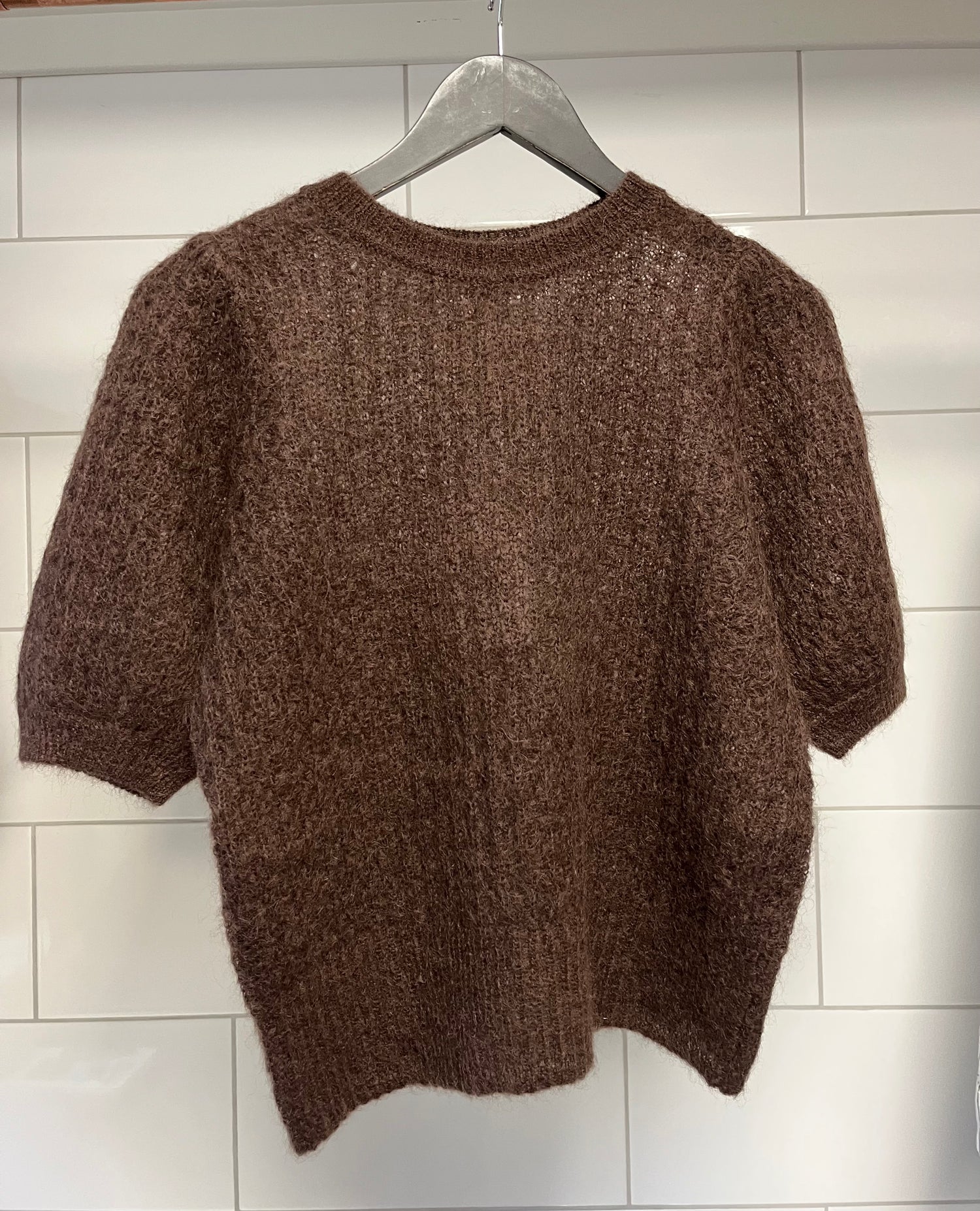 Nydelig kortermet strikk fra Dear Dharma Denne delikate strikken er laget i en myk og luftig mohairblanding. Dear Dharma står for dyrevennlig strikk, og dette plagget kombinerer både kvalitet og omtanke. Den kortermede modellen gjør den lett og anvendelig hele året – bruk den alene på varmere dager, eller style den med en skjorte eller bluse under når det er kjøligere. Passer like fint til bukser som til skjørt, enten du ønsker et avslappet hverdagsantrekk eller en mer pyntet stil.