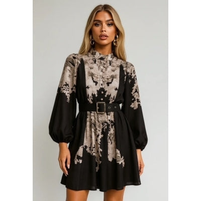 Elegant og tidløs kjole fra Lecocoo. Denne kjolen er perfekt til både fest og hverdags. vakkert begie blomsterprakt på svart bunn, og et bredt avtagbart belte i livet som gir en definert silhuett. Ballongermer, mansjetter og høy krage tilfører et moderne og stilrent utrykk.